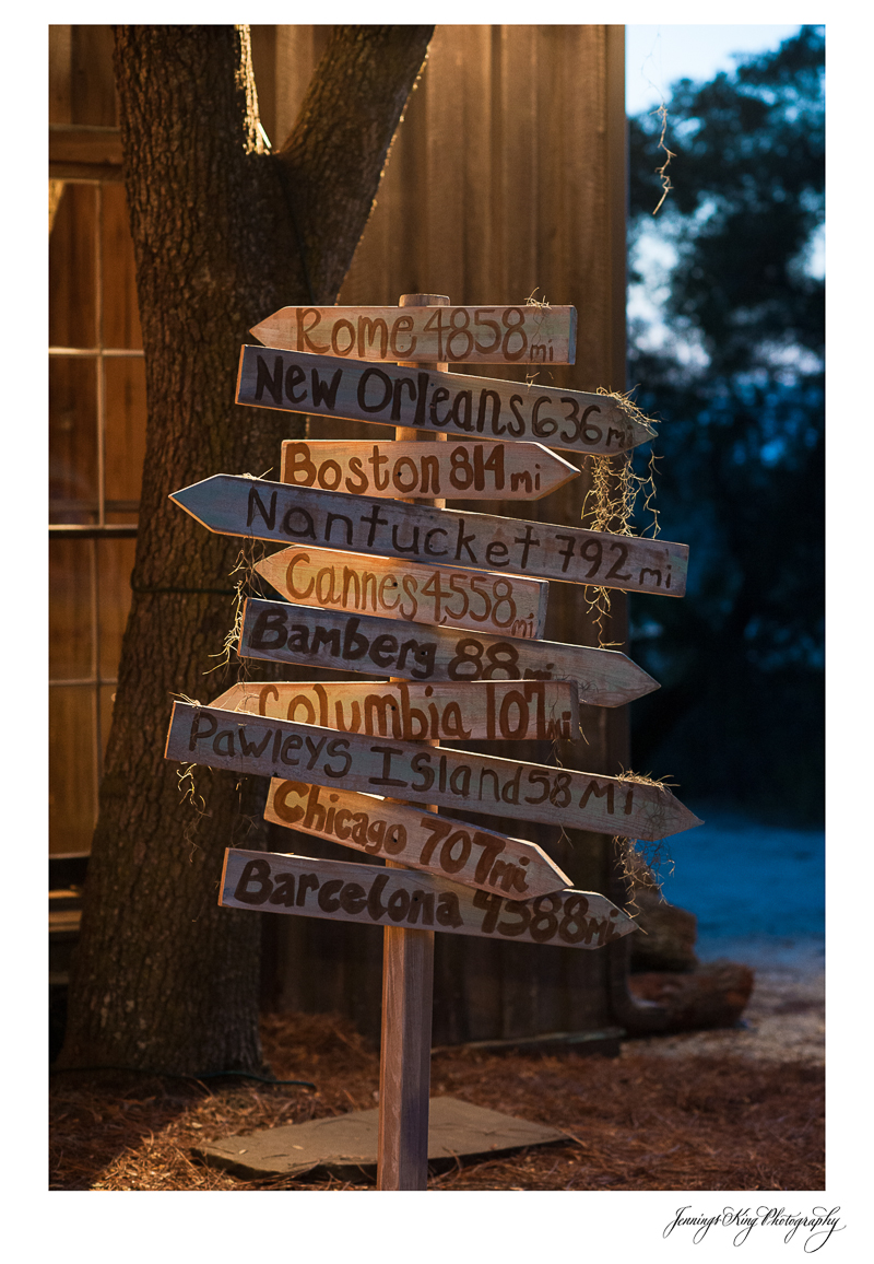 Mary Simms and Alex exchanged wedding vows at the beautiful Cotton Dock at Boone Hall Plantation (which by the way is the most sought after venue now because Blake Lively & Ryan Reynolds were married here! I hear it is booking out into 2015!) Mary Simms and Alex were so great to work with through their engagement session, the bridal session and finally the wedding day. In this wedding there were many details documenting points in their lives. I was told almost all of them by Mary Simms and her mother, so my camera was ready to capture these details. I honestly couldn’t choose from all the wonderful pictures of moments, and that is why there are so many! To most, they will not seem significant, but to Mary Simms & Alex and their families, they will. A moment frozen in time, forever, a hard copy to remember it by in years to come: excavating a bottle of bourbon and toasting, greeting guests with a mileage sign post to their favorite places to name a few! Exuberance and joy was all around as the bride, Mother, and bridesmaids dressed and admired the hand sewn handkerchiefs, the jeweled garter and meaningful rings. The love that was shown between the father and daughter dance melts me, and always will, as it reminds me of my daddy.